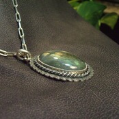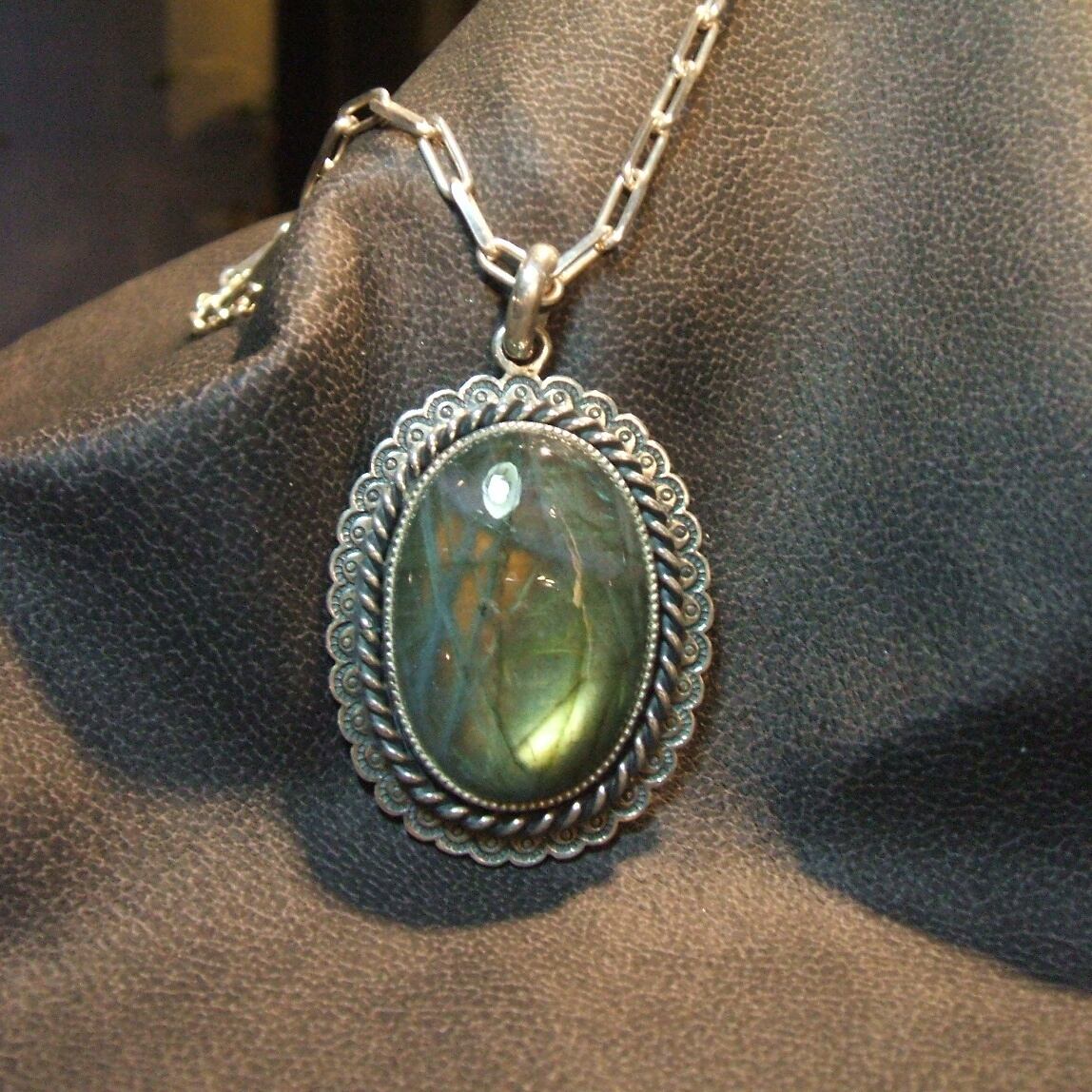 大きな石全体にラブラドライトレッセンスと呼ばれる遊色効果が見られる、大変美しいラブラドライトを使用した、シルバーのペンダントネックレスです。