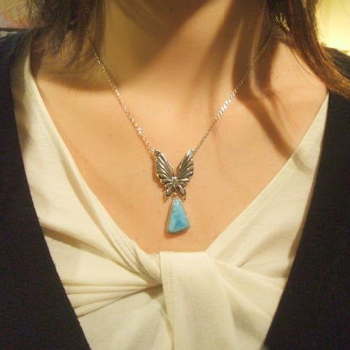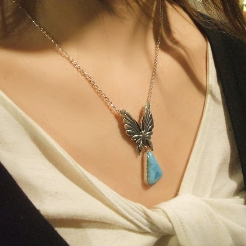 ハイグレードのラリマーを付けた蝶モチーフのペンダントネックレスです。