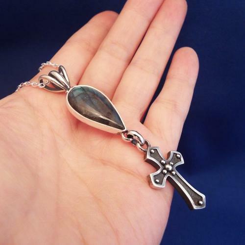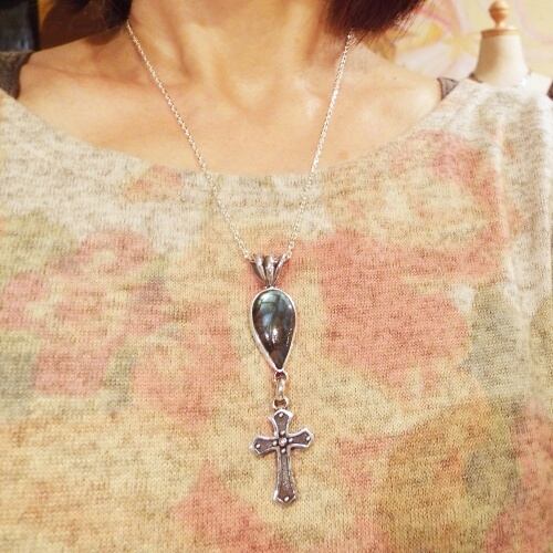 神秘的な輝きを持つラブラドライトにクロスを下げた、ロザリオのエッセンスを持つペンダントネックレスです。