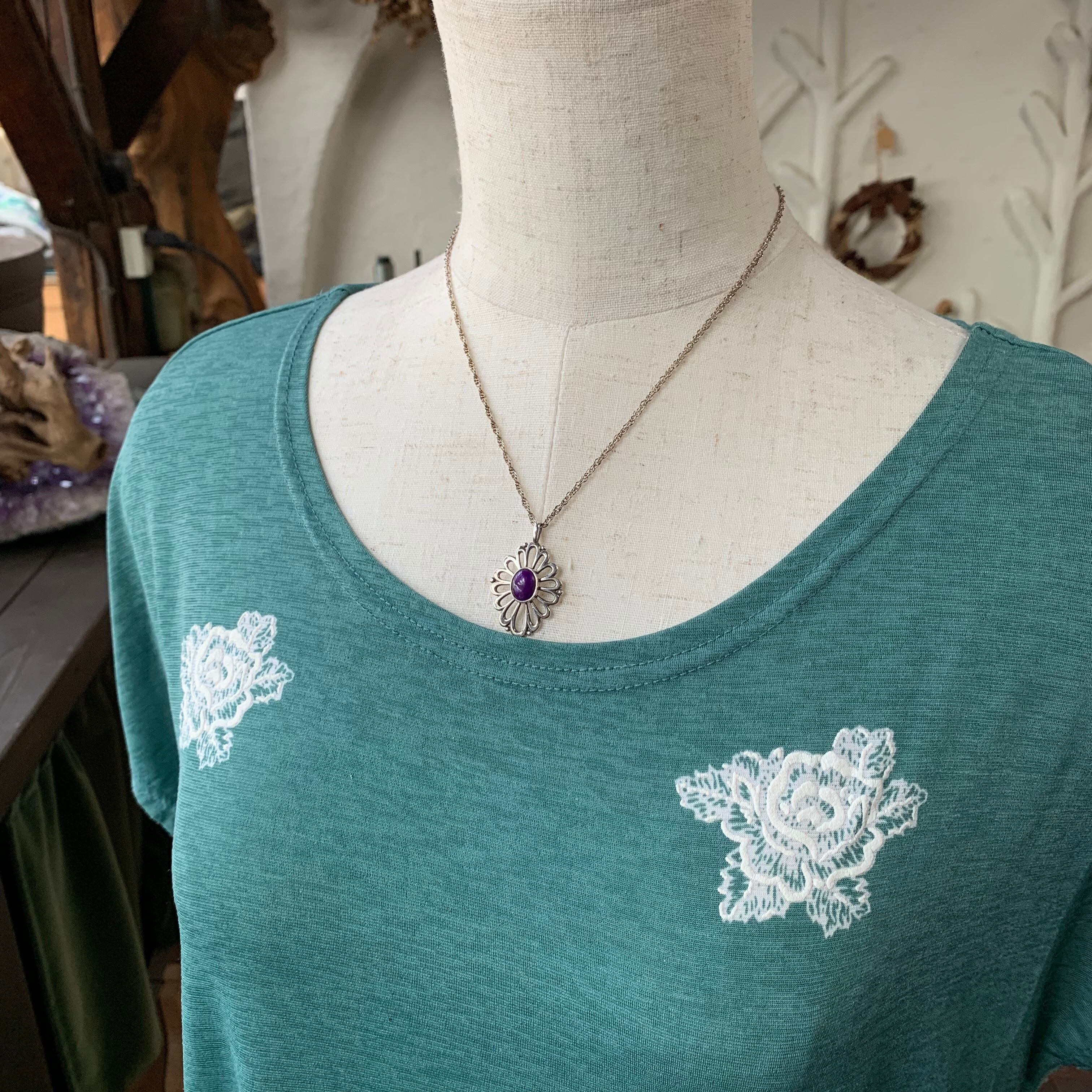 透かされているため、程よいボリューム感で胸元を華やかに飾ります。